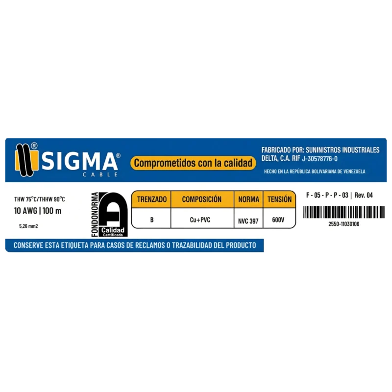 Cable THHW Calibre 10 AWG Rojo, Rollo 100m, Sigma
