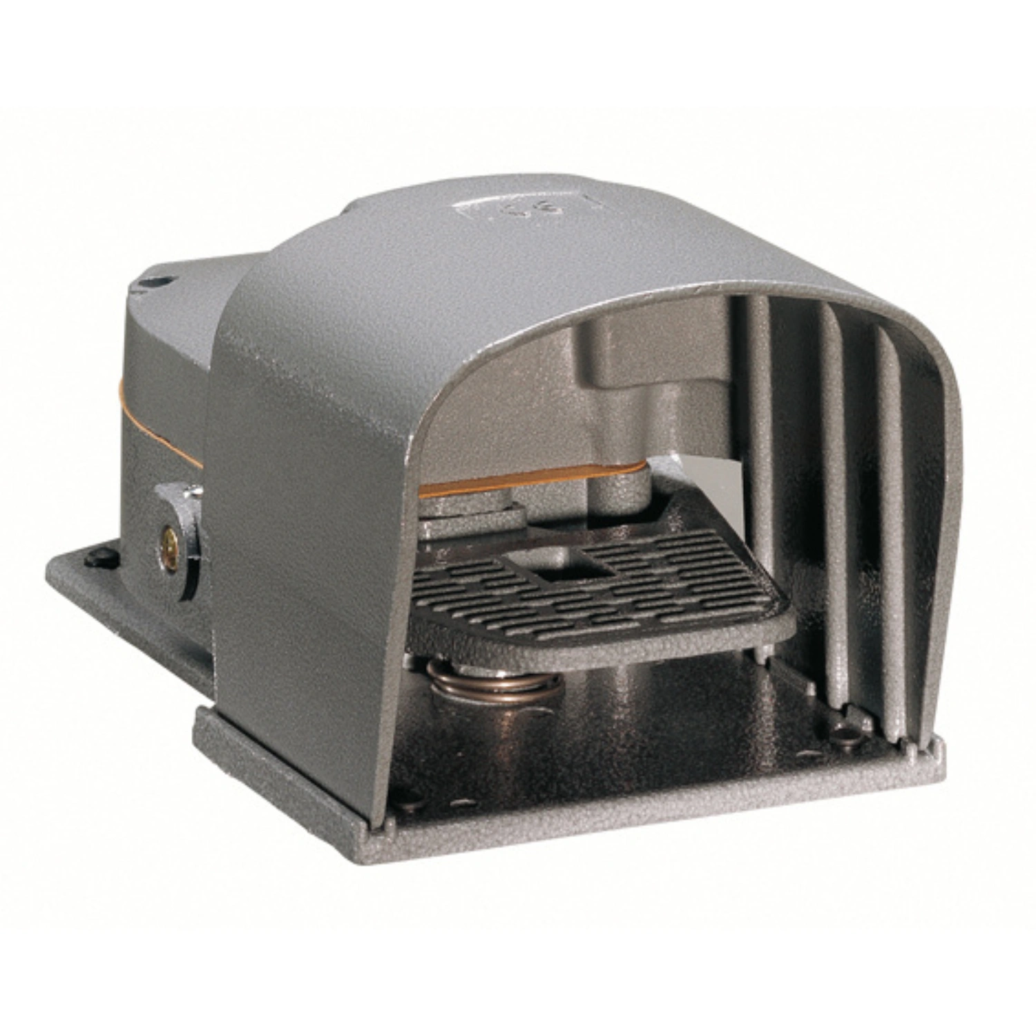 - Artículo: Interruptor de pedal (Foot switch) metálico con cubierta de seguridad para control industrial.